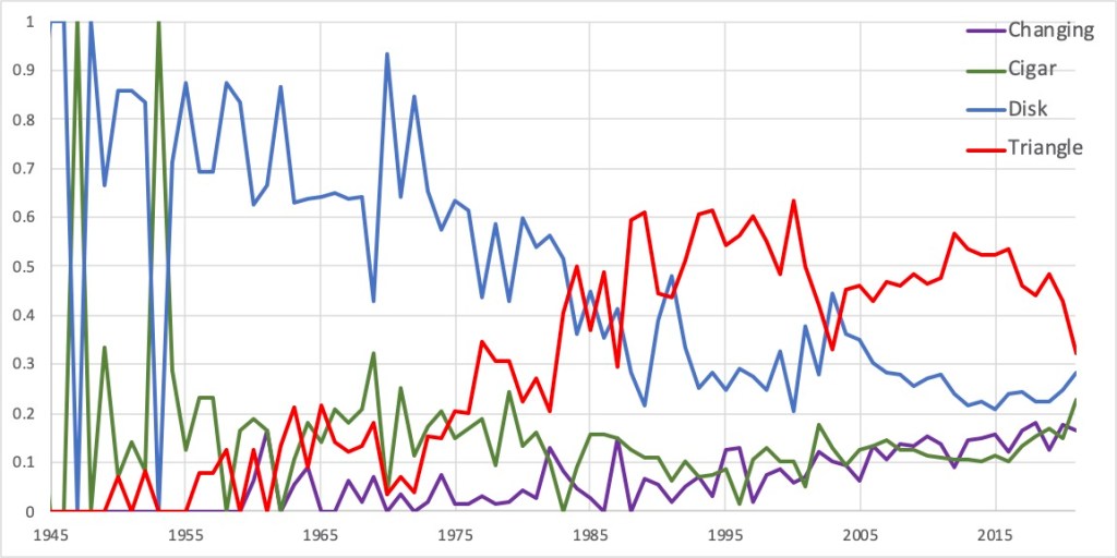 It has been noted that the UFO phenomenon appears to have evolved over time, perhaps as a result of our response to it. The NUFORC database classifies UFO reports into twenty shapes. The figure below plots the relative frequency of four of the UFO shapes: disks, triangles, cigars, and changing shapes observed between 1940 and 2020. Prior to 1985, the classic disk shape of a flying saucer was sighted more frequently than the triangular shape, which today is seen more frequently.