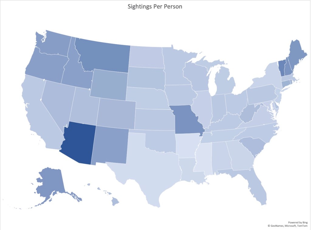 Some places have fewer sightings than expected while others have more. For example, Arizona has more than three times more reports per capita than, say, Ohio. One explanation is that besides human populations, UFOs may be interested in other places such as nuclear weapons facilities.